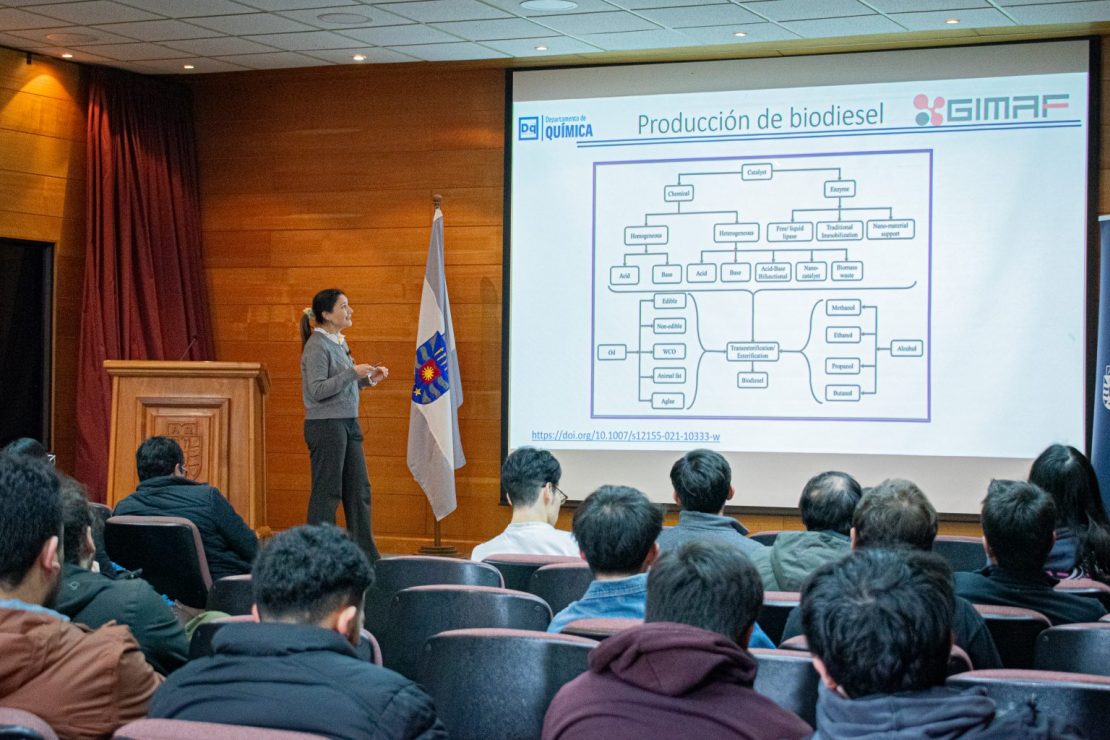 “La mañana de hoy se presentó la charla relacionada a biocombustibles, concretamente a biodiésel, para que estudiantes de pregrado y postgrado puedan conocer de qué trata, cómo se produce y qué alternativas existen para su uso como combustible”, agregó la académica.
